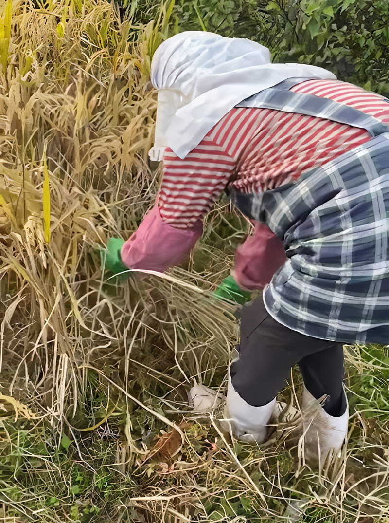 完全無農薬ですので除草剤はもちろん使いません。田植え後に雑草が次々と生え、5月から収穫の10月まで手作業での除草が続きます。